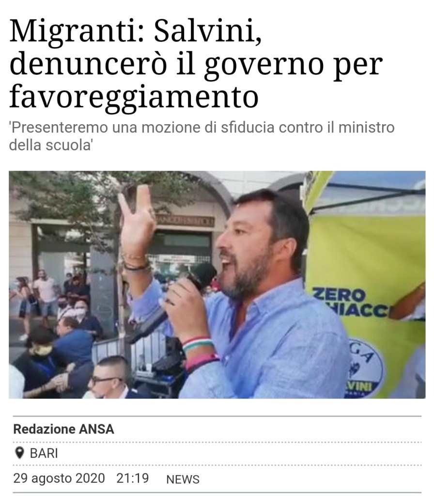 “Denunceremo per favoreggiamento dell’immigrazione clandestina l’attuale governo e presenteremo una mozione di sfiducia contro il ministro della scuola, perché non è possibile che a 15 giorni dalla riapertura non si sa come, dove e quando ricominciare”. Lo ha detto a Bari il leader della Lega, Matteo Salvini, durante un incontro per la presentazione dei candidati al Consiglio regionale pugliese.
