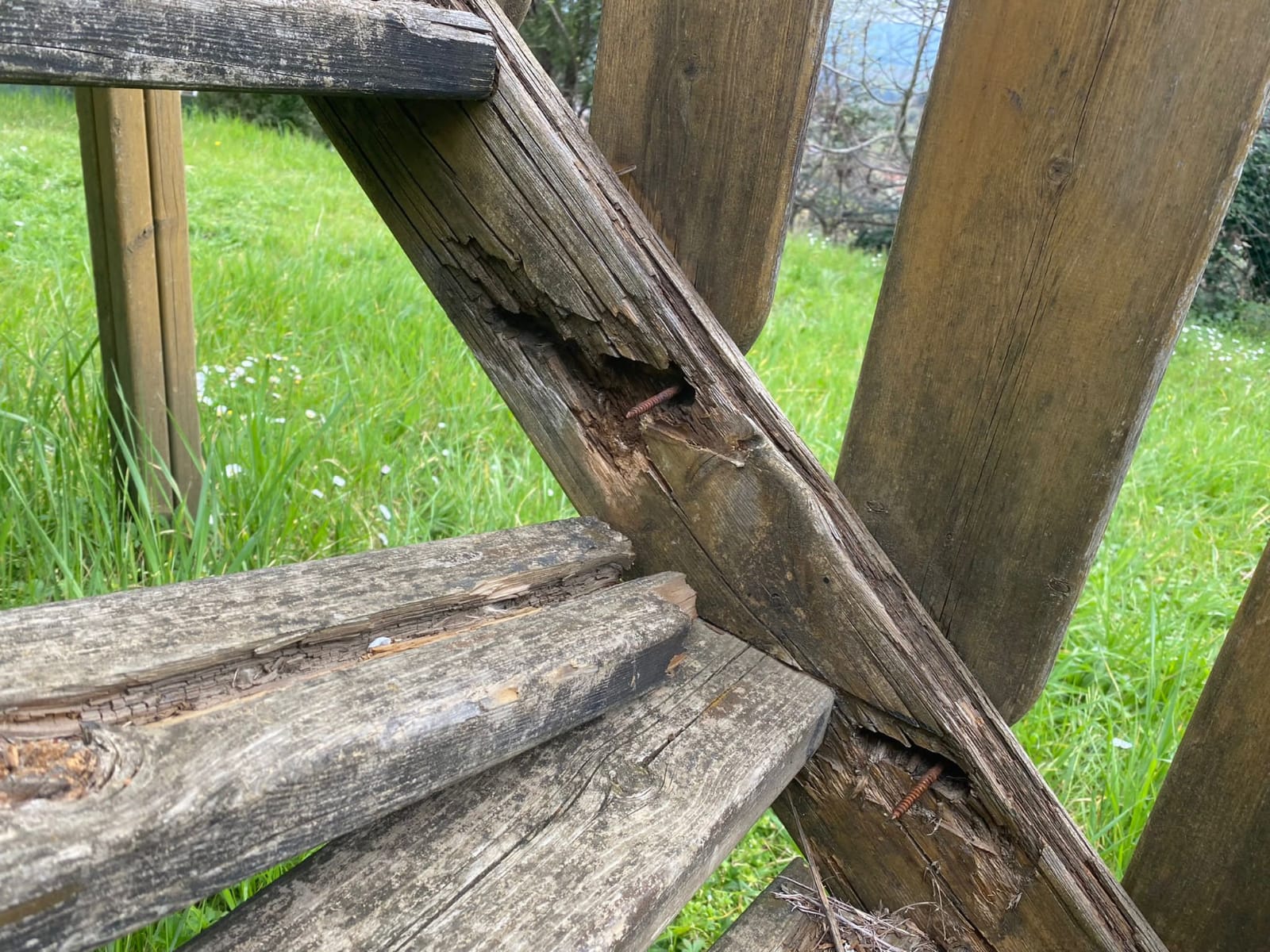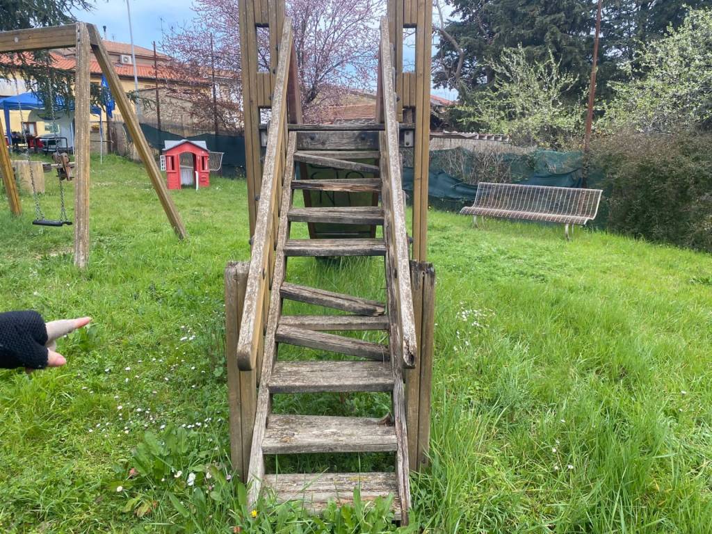 📌Pericoloso lo scivolo dove la rampa della scala per salire ha gradini di legno rotti con spunzoni schegge aguzze che sporgono.
