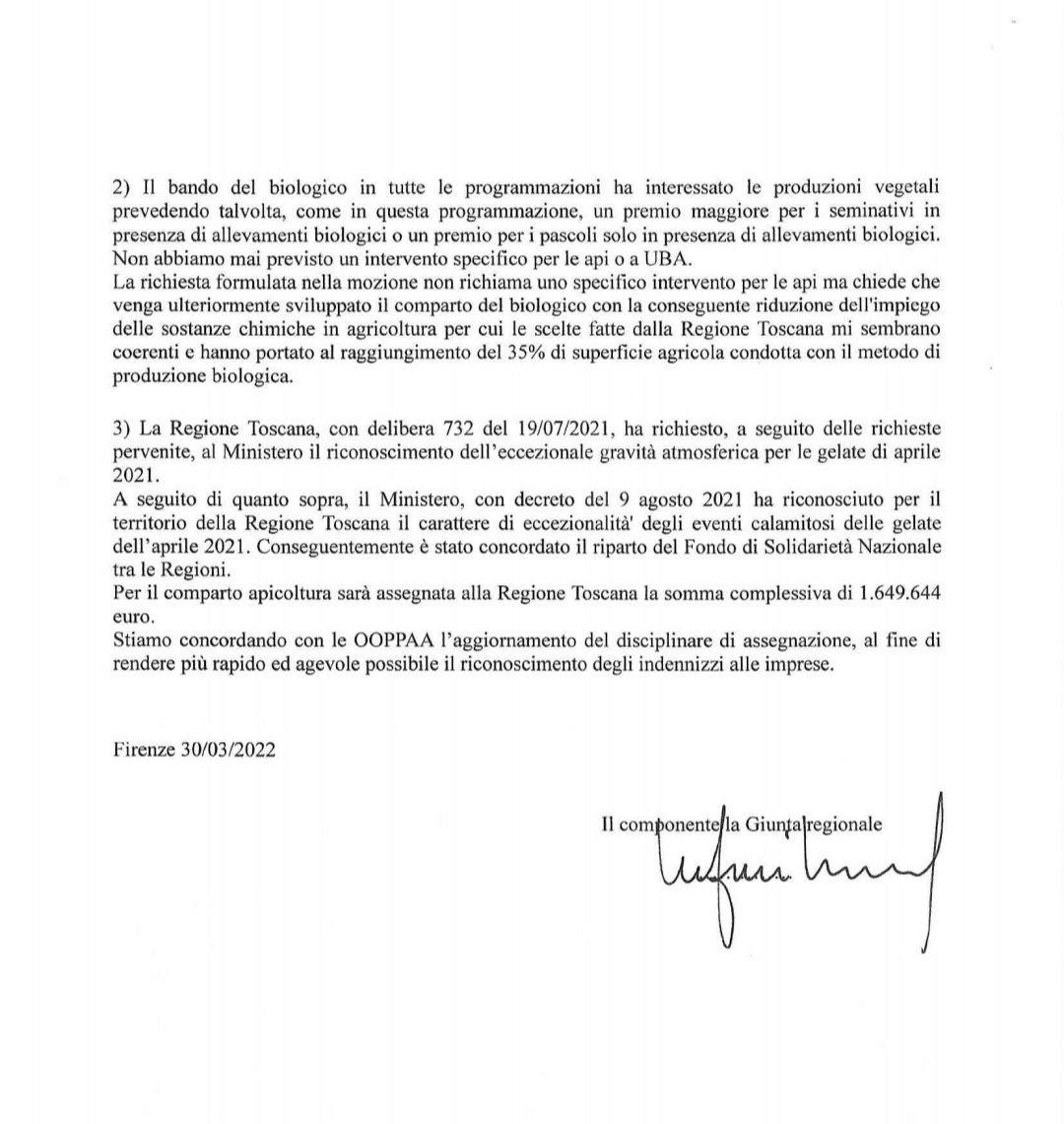Il consigliere regionale Marco Casucci precisa che: “La Regione Toscana, nella serie di atti già presentati ed altri in itinere da parte della Lega Salvini, ha richiesto il riconoscimento dell’eccezionale gravità atmosferica per le gelate di aprile 2021– e continua- a seguito di questo il Ministero con decreto del 9 agosto 2021, ha riconosciuto il carattere di eccezionalità degli eventi calamitosi delle gelate di aprile 2021″.