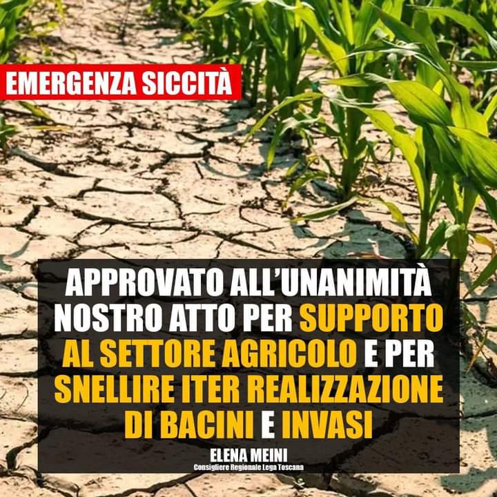 Il Consiglio regionale approva con voto unanime una mozione del gruppo Lega, prima firmataria Elena Meini, sull’emergenza siccità in Toscana. L’atto d’indirizzo accoglie emendamenti presentati dal Partito democratico (a firma Andrea Pieroni) e impegna la Giunta regionale “a supportare con idonee iniziative il settore agricolo toscano già duramente colpito dalle ripercussioni dovute al conflitto in atto e all’aumento dei costi energetici già consistenti prima dello scoppio della crisi ucraina”.