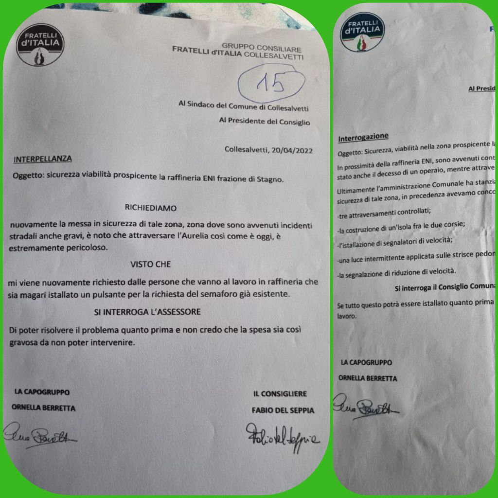 «Il primo attraversamento pedonale rischioso per chi intende attraversare la strada, sia per raggiungere la fermata dell’autobus verso Livorno, sia per recarsi nei negozi – dice il Capogruppo consiliare di F.lli d’Italia, Ornella Berretta– è quello collocato in prossimità del chilometro 319 ed è caratterizzato dalla costante presenza di pedoni che ci passano, data la presenza sia di diverse abitazioni, che della vicina via Aiaccia, dove spesso le auto svoltano a velocità sostenuta provenendo dall’Aurelia, creando quindi ulteriore pericolo ai pedoni». Ricordiamo la presentazione di atti di F.lli d’Italia in Consiglio Comunale, sostenuti da Lega Salvini Premier di Collesalvetti, che alleghiamo in calce.