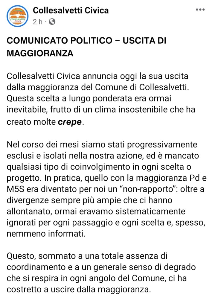 Collesalvetti Civica esce dalla maggioranza in Comune Postato il novembre 24, 2022 di Laura Petreccia Condividi: Condividi su Telegram (Si apre in una nuova finestra) Telegram Condividi su WhatsApp (Si apre in una nuova finestra) WhatsApp Condividi su Facebook (Si apre in una nuova finestra) Facebook Mi piace Caricamento... Correlati