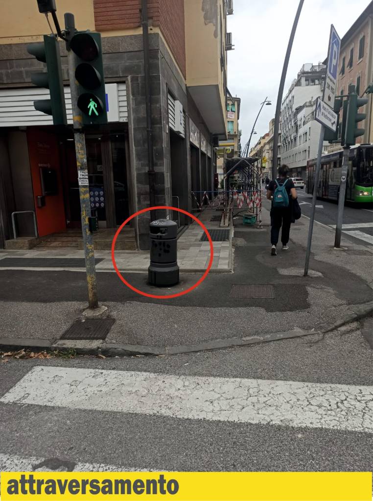 Alcuni cestini rendono difficile la fruizione dei marciapiedi, dei percorsi LOGES, degli attraversamenti pedonali o degli stalli per persone disabili.
