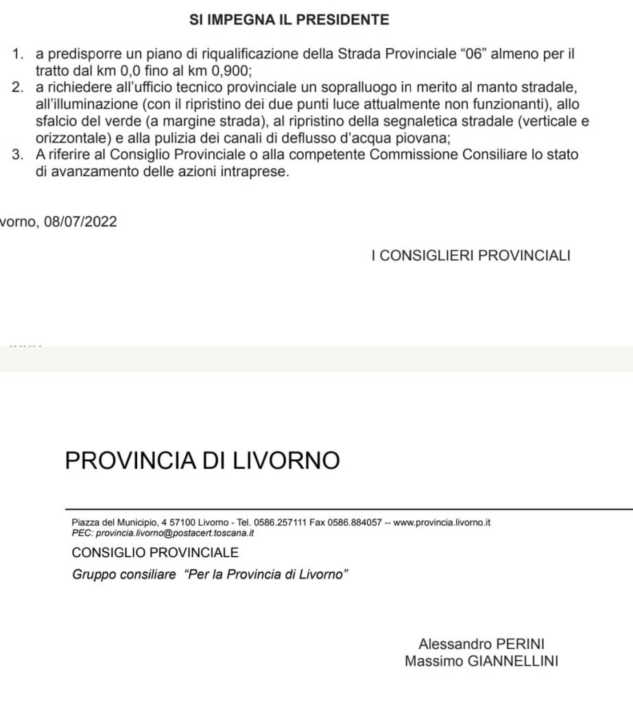 La mozione presentata in Consiglio Provinciale di Livorno elenca una serie di criticità della SP6 della Frazione di Parrana San Martino.