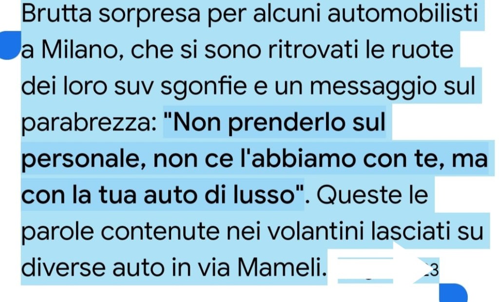 Milano, sgonfiano le ruote dei suv, blitz del ‘Comitato su-versive” Postato il giugno 21, 2023 di Laura Petreccia Condividi: Condividi su Telegram (Si apre in una nuova finestra) Telegram Condividi su WhatsApp (Si apre in una nuova finestra) WhatsApp Condividi su Facebook (Si apre in una nuova finestra) Facebook Mi piace Caricamento... Correlati