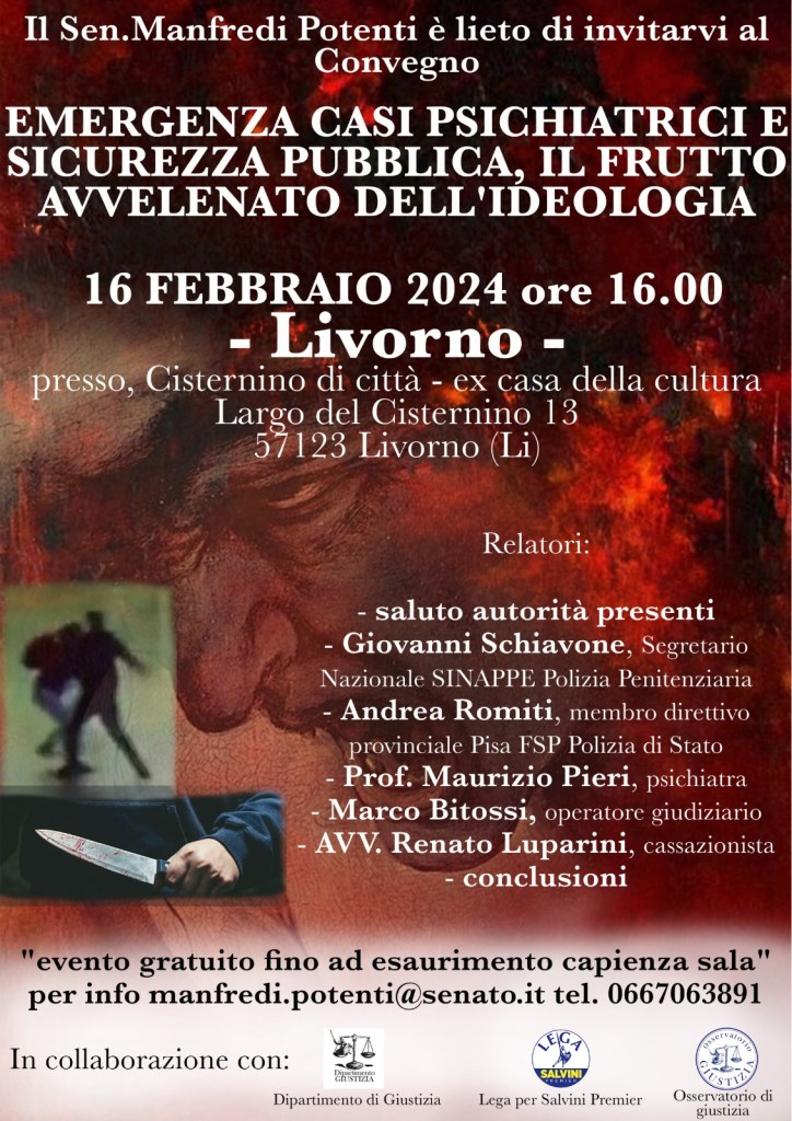 Al convegno, oltre al senatore Manfredi Potenti hanno preso parte il consigliere comunale livornese Andrea Romiti, ex capogruppo di Fratelli d’Italia e membro direttivo provinciale della Polizia di Stato, Giovanni Schiavone, segretario generale del sindacato di Polizia Penitenziaria, lo psichiatra di La Spezia Maurizio Pieri, l’avvocato cassazionista Renato Luparini e il funzionario Marco Bitossi, addetto agli uffici del Magistrato dorveglianza. Il convegno avviene a neanche un anno dal barbaro omicidio della psichiatra pisana di 55 anni Barbara Capovani il 23 aprile dell’anno scorso per mano del suo ex paziente, il 35 enne Gianluca Paul Seung di Torre del Lago.